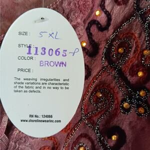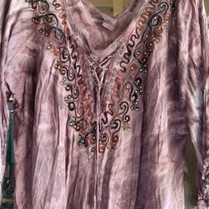 This is a very nice, new with tags boho style top. It has a 5X size, but would fit several sizes depending on how flowy you want it to be. It measures approximately 26 inches from armpit to armpit and 35 inches from the nape of the neck to the hem. It is embellished with beading, embroidery, and lace and a crisscross tie at the neck. It is made of 100% rayon. It has a gauze texture to it. The tag says it is brown, but it looks to be more in the mauve or purple tones to me.