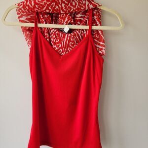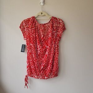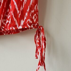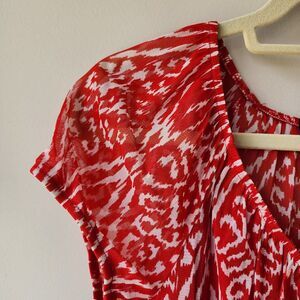 Red and white ikat print. V neck, short sleeve blouse with elastic waist, neck, and sleeves. Can be worn with or without red, v neck cami. Includes snaps to keep cami/bra straps in place.