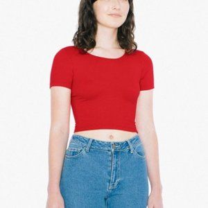 NWT Short Sleeve Scoop Neck American Apparel Top. American Apparel Women's Cotton Spandex Jersey Short Sleeve Crop T-Shirt. 92% Cotton, 8% Spandex. Double-needle neckline hem, sleeves and bottom hem. This iconic American Apparel fabric is a true staple. Cotton Spandex is a sleek, stretchy fabric with a studio-wear sensibility. Solid bright red color is easy to mix and match and pair with your favorite jeans, skirts, shorts and more. accessorize with statement jewelry, bags, sneakers you name it!