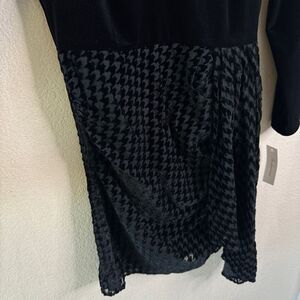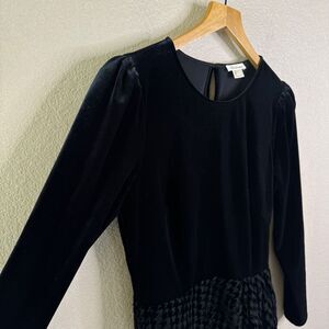 Unique velvet dress features solid velvet top with asymmetrical, houndstooth burnout velvet skirt. Dress is lined under the handkerchief style skirt. Long sleeves. Side zipper. Knee length.