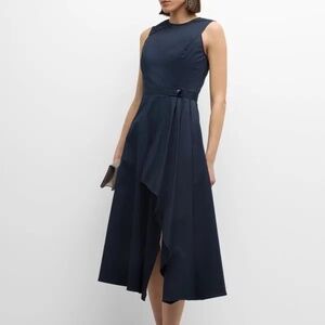 NEW with TAGS The Shoshanna Palmer pleated midi dress features a jewel neckline, sleeveless design, and snap waist tab. The dress has a side slit hem and falls below the knee. The A-line silhouette is completed with an invisible back zipper. The dress is made of cotton and spandex and is unlined. It is recommended to dry clean the dress.