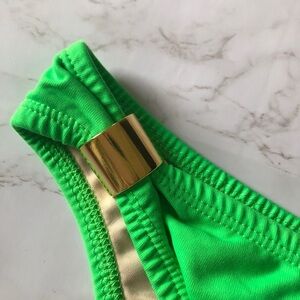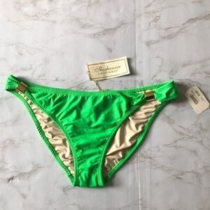Shoshanna lime green bikini bottom with gold metal detail on hips. New with tags with hygiene liner still intact. Excellent condition with no flaws noted. Size XL, see pics for measurements.