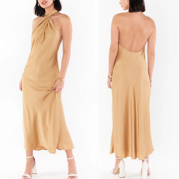 NWT Show Me Your Mumu Jasmine Halter Midi Dress in True Gold Luxe Satin