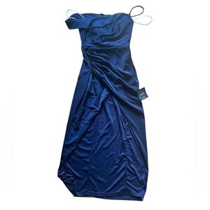 NWT Showing Off a Little Navy Blue Asymmetrical Tulip Midi Dress size XS. Perfect for holiday or NYE parties!