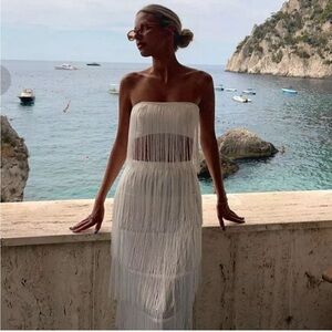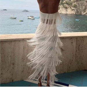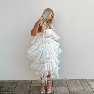 New with tags women’s US size 6. White strapless crop top bralette and midi skirt. Fringe detailing all over. Bodycon, fitted style skirt.