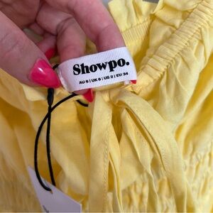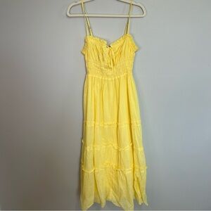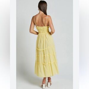 NWT Showpo Schiffer Midi Dress Strappy Ruched Tie Front Tiered Yellow Women’s 2