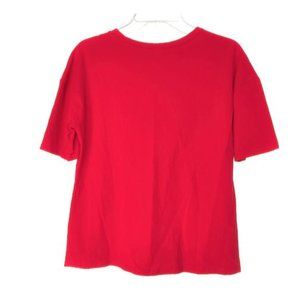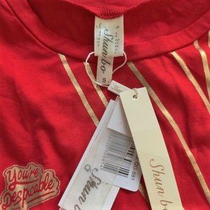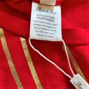 Shun bo red Bugs Bunny shirt with gold print round neckline; short sleeves; 95% cotton, 5% spandex.