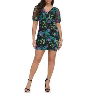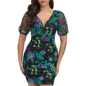 NWT Siena Floral Embroidered Mesh V-Neck Short Puff Sleeve Mini Dress