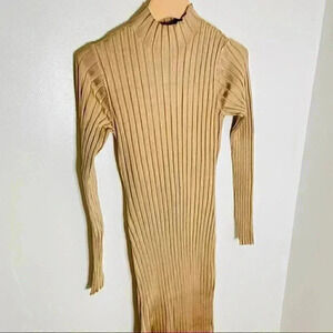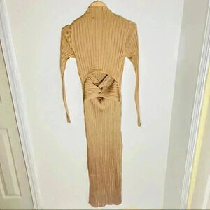 Description: Unlined; Mid-weight ribbed knit; Lustrous finish; Turtleneck and long sleeves; Back cutout with twisted gather; Knee-high side slit; Pullover design, no closure.