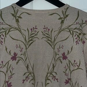 Elevate your wardrobe with the vintage silk floral cardigan from the Silk Club Collections. This elegant tan sweater features a delicate purple floral design with green vines, perfect for adding a touch of sophistication to any outfit. Ideal for layering, this cardigan combines style and comfort effortlessly. There’s a sparkle to this cardigan in the fabric that I love, it adds a beautiful fun feminine touch to it.
