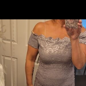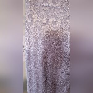 Beautiful Silver off the shoulder gown with sparkles from head to toe. Dress has scalloped lace neckline and rear hidden zipper closure.