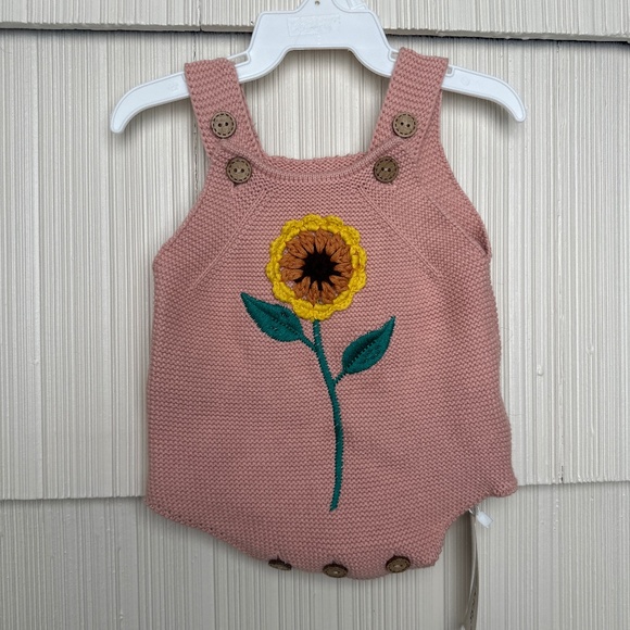 Adorable Pink knit romper, with sunflower embroidery on front. New with tags. Never worn. Smoke free home.