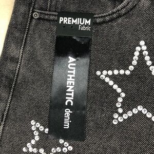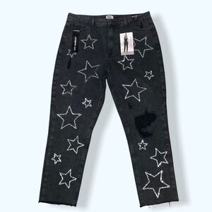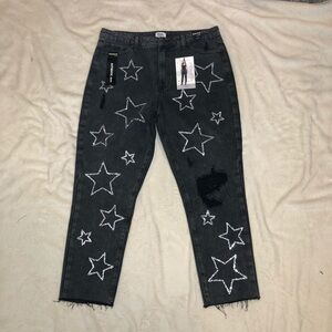 Black denim, high rise, straight leg jeans with rhinestone star accents on the front. Unfinished hem.