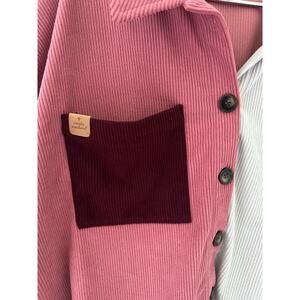 Maroon Color Block Cropped Corduroy Shacket by Simply Southern features a cropped pink, burgundy and grey corduroy button up shacket, with tortoise buttons, collar, button cuffs, maroon right chest pocket with a PU leather Simply Southern label, and small side splits at waist. 100% polyester. Machine wash cold. Lay flat to dry.