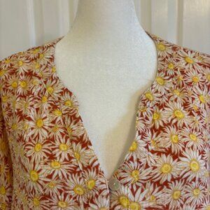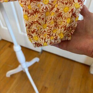 Super cute! Sunflower print in burnt orange with yellow and white sunflowers. V-neckline with buttons down the front. Long balloon sleeves and peplum hem. Made of 100% cotton. Hand wash.