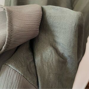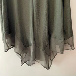 NWT This trapeze top from Vera Wang is a made with a beautiful lightweight and flowy hammered polyester silk. The V-neck and sleeveless armholes have a raw edge finish, and the handkerchief hemline is offset with crinkled georgette. The color is a gorgeous loden green / cool dark olive.