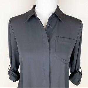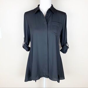 NWT. Simply Vera Vera Wang black chiffon roll-tab blouse/shirt with front pocket. asymmetric hem. Size S. Pit to pit 19" flat, shoulders 14", sleeves 24', length front 26', length 30". G1558.