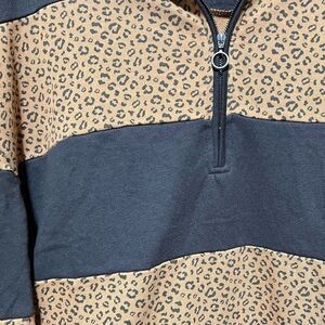 Solid dark gray and leopard patterned striped quarter zip pullover with a drawstring waist tie, elastic wrists, and zipper neck closure. Made of cotton and polyester.