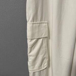 High waisted. Zipper button closure with adjustable drawstring. Front pockets. One Cargo pocket. Can be used as a wide leg pant or jogger style by pulling the hem drawstring. Rayon/Tencel blend for a super soft fabric. Extra button. Waist: 31”, rise: 13”, inseam: 28.5”