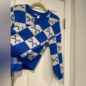 NWT Sincerely Jules Size XS Blue Check Bows Soft Stretch Crew Button Cardigan