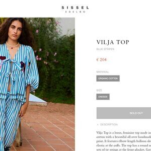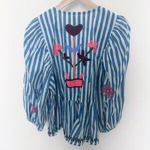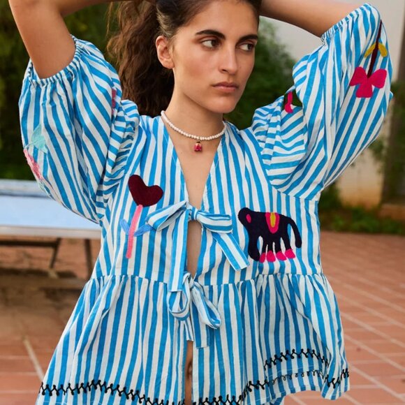 Vilja Top is a loose, feminine top made in 100% organic cotton with a beautiful all-over handmade striped screen print. It features elbow-length balloon sleeves gathered with elastic at the cuffs. The top has a round neckline and three sets of tie strings at the front placket. Gatherings at the cutline create an elegant peplum, adding a flattering shape to the top. The top is adorned with charming, eye-catching motifs, including flowers, hearts, elephants, and other beautiful symbols, all created with intricate suzani