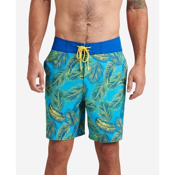 * How bout a little help from your fronds to make these board shorts super sweet? A palm-frond pattern offset with color block borders brings the style, while poly/spandex in a 4-way stretch brings the comfort. Side pockets and a back flap pocket plus a drawcord waist keep these shorts easy breezy.