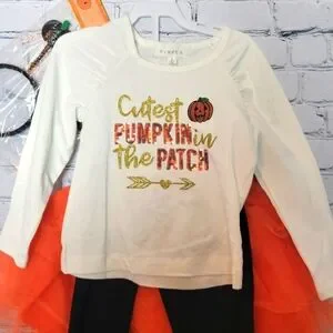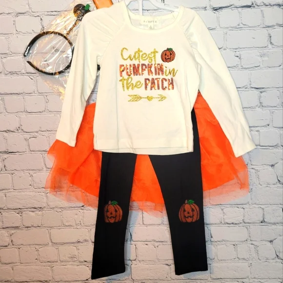 Dress your little one in this adorable pumpkin-themed costume set. Featuring a white top with colorful pumpkin graphics and black leggings with pumpkin details, it's perfect for Halloween fun. The orange tutu adds a playful touch.