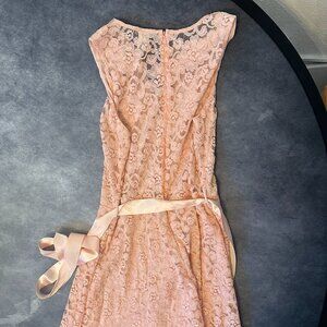 This luxurious, lacy dress is the perfect garment for spring and/or Easter! With a peachy pink color and a vintage silhouette, it's bound to impress! The blinged-out neckline and ribbon belt add even more glamour to the look!