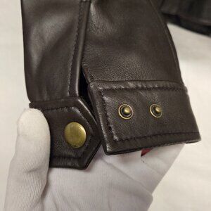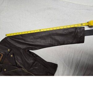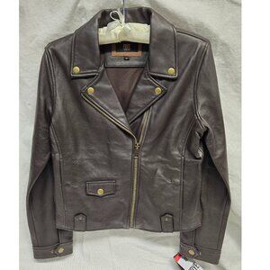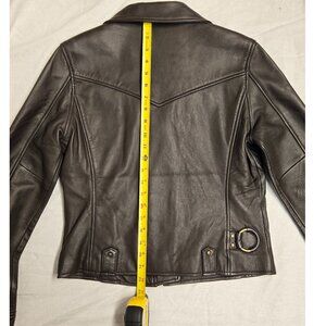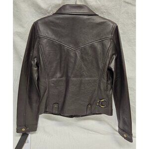 Brand new with tags, this classic biker jacket has an asymmetrical zipper, brass-tone hard wear, and is made from top grain lamb leather with a polyester lining. It has snap closure pockets and an adjustable snap cuff. Made in India. This jacket is a size medium; according to Frye's chart on this jacket, that equated to a size 6-8, but I took pictures with measurements as those are always more reliable.