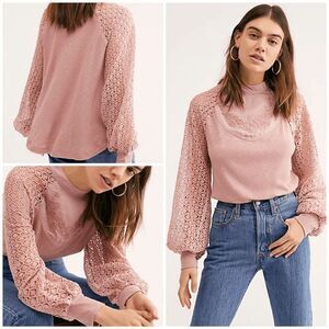 Slouchy thermal top featuring sheer crochet lace long sleeves.