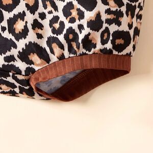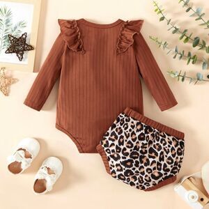 Size 6-9 months, 2 piece baby girl romper set, ribbed, brown long sleeved, leopard shorts, infant.