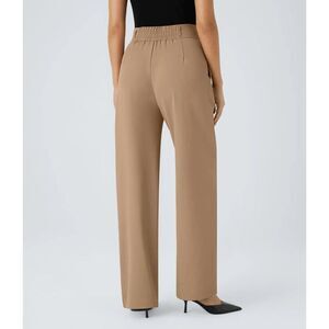 High Waisted Button Zipper Side Pocket Shirred Straight Leg Work Pants