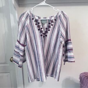 Vibrant blue and red embroidered detailing on the sleeves and neckline
