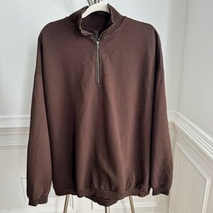 Super rare and new trending color. Stylish, cozy and comfy in the new Espresso brown color, half-zip pullover. Fleece interior and cotton outside, sweatshirt finish. Perfect for casual wear, lounge wear, travel. Beautiful color. It has an oversized fit and dropped shoulders, small can probably fit a medium depending on how oversized you’d like to wear it. New with tags.