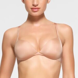 The t-shirt bra that started it all. This classic foundation with demi coverage has 360-stretch technology for a custom-made fit even when youre between sizes. Made of our signature buttery-soft fabric with a second-skin feel that makes you forget youre wearing a bra. Offers unparalleled support with its lightly lined cups and flexible underwire that doesnt dig. Features adjustable straps and a hook and eye closure in the back. Fits true to your SKIMS bra size.
