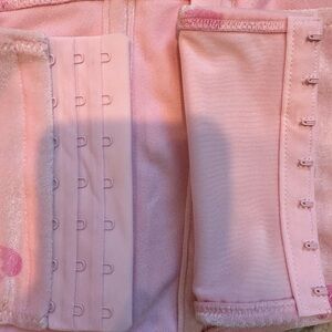 Elegant pink corset bra with heart patterns. Features delicate lace trim. Perfect for intimate wear.