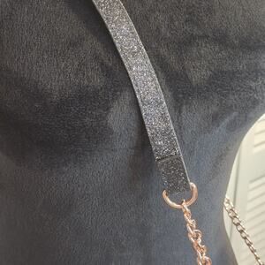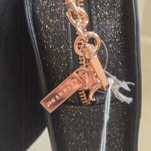 The Skinny Dip Champagne Bottle Purse is a small crossbody bag in a unique black and rose gold color scheme, perfect for a party or festival. The bag features a zip closure, black sparkle glitter handle/strap, and rose gold hardware accents. With a dreamy and fun character, this lightweight and water-resistant purse is adorned with glitter studs and faux pearl studs, making it a stylish and statement-making accessory for any occasion. The limited edition design includes a detachable chain strap and is coated for added durability, making it a versatile and eye-catching choice for any fashion-forward individual.