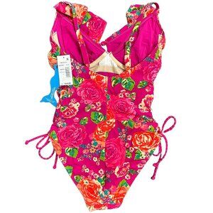 Skinny Dippers Rosalina Underwire Ruffle Neckline One-Piece Swimsuit – Pink Floral, Size Medium