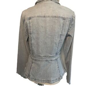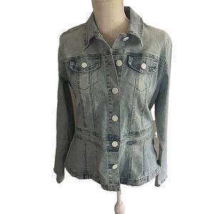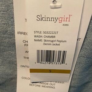 NWT Skinnygirl Chambray denim country core jacket with signature button front closure with two breast pockets. The tailored seams and feminine peplum cinches at the waist for a sleek silhouette. Perfect layering piece. New with tags, excellent condition, no flaws. Measurements: Piy to Pit 19.5”, Length 23.5”, Sleeve 24.5”