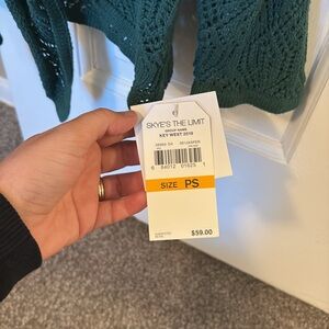 A NWT crochet sweater size PS. This sweater has a tie at the waist and is a fun dark green from Skye’s the Limit