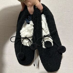 Handcrafted from soft, natural shearling in black color, these ballet-style slippers offer warmth and comfort on cold days, blending function with cozy sophistication. Featuring a slip-on design with a plush shearling insole and a durable rubber sole, they are ideal for both indoor relaxation and outdoor outings. Detailed with a drawstring closure and delicate pom poms, they make an elegant addition to any casual or loungewear ensemble. Includes Sleeper branded dust bag.