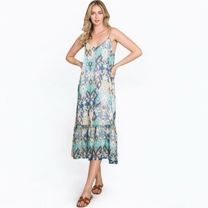 NWT Sleeveless Boho Ruffle Printed Woven Blue Green Cami Maxi Dress