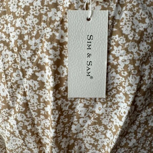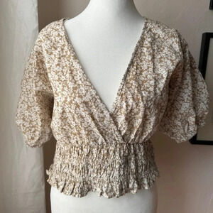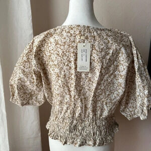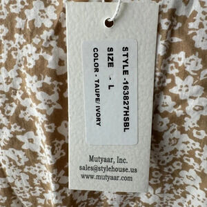 NWT Slim & Slam Size Large Ivory Taupe V Neck Short Sleeve Smocked Waist