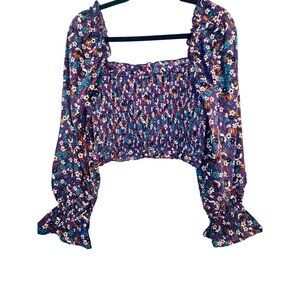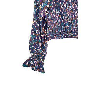 This adorable NWT smocked purple floral blouse size small has a vibrant shade of purple with full sleeves and ruffled hem at wrist. Ideal for a fun, playful wardrobe addition.