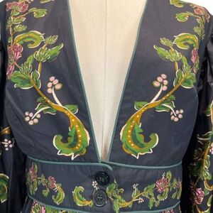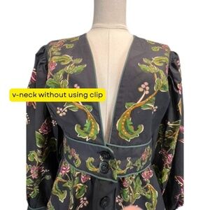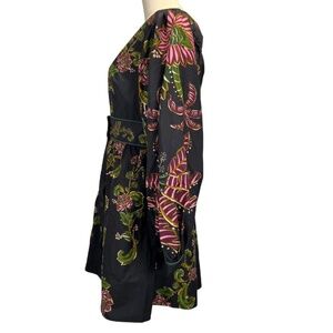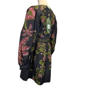 Embrace bold elegance with the Black Ravenala Puff Sleeve Mini Dress from FARM Rio. Featuring a captivating botanical pattern in vibrant greens and pinks, this mini dress pairs a flattering V neckline with voluminous puff sleeves for a playful silhouette. The intricate detailing transforms this piece into a true standout, perfect for adding a whimsical touch to any occasion
