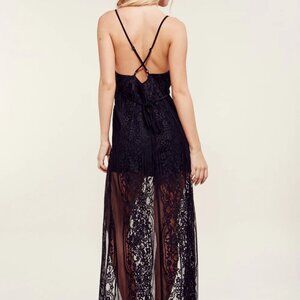 You can't go wrong in the For Love & Lemons Longhorn Maxi Dress. This body style is a For Love & Lemons classic and they searched high and low for the gorgeous placement lace. Black lace maxi dress, partially lined with two front slits! Adjustable crossing straps and tie at waist to help give a custom fit.