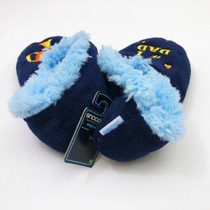 NWT, New With Tags Sales Samples. Men's Snoozies Pairables dark navy blue #1 DAD slippers. The perfect gift for your #1 Dad. Embroidered on one slipper is #1 DAD in gold thread with gold stars around it. On the other slipper is an embroidered gold colored chalice with a blue ribbon on it and the number 1. Soft and comfortable.