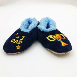 NWT, New With Tags Sales Samples. Men's Snoozies Pairables dark navy blue #1 DAD slippers. The perfect gift for your #1 Dad. Embroidered on one slipper is #1 DAD in gold thread with gold stars around it. On the other slipper is an embroidered gold colored chalice with a blue ribbon on it and the number 1. Soft and comfortable.