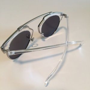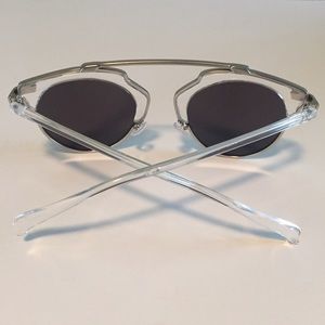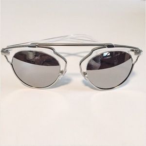Limited quantities. Available in multiple colors. Great alternative to the Dior So Real Sunglasses. Silver/Lucite frames and Mirrored Silver lenses. Meg Rimless Cateye Sunglasses.