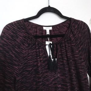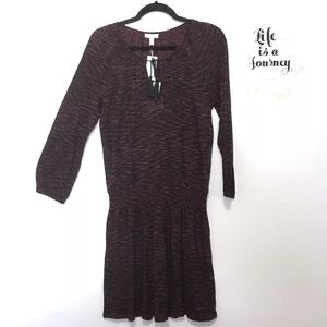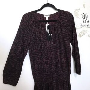 A marled pattern of purple or maroon and black covers a semi sheer flowy blouson drop stretch waist dress! Split neck with tasseled ties and gathered elastic cuffs on 3/4 sleeves! Fun and flirty, just right for a date night! Flowy and flattering! Perfect condition, never worn!